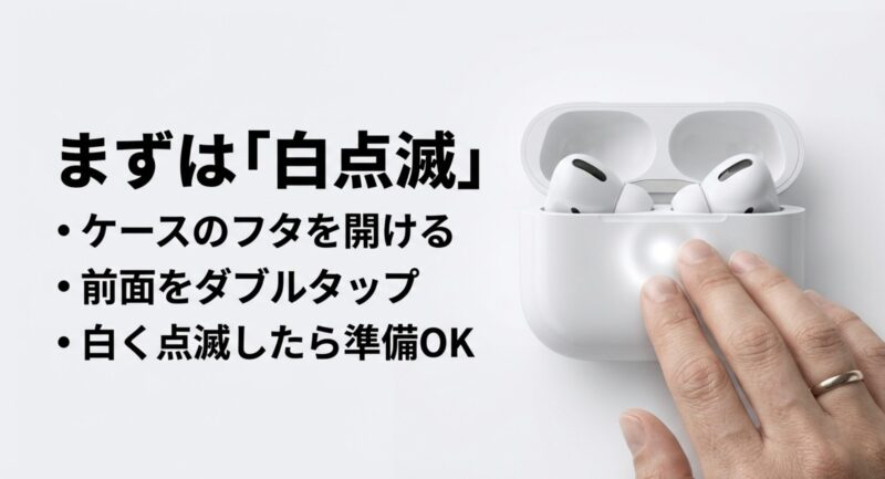 最初にいちばん大事なのが、AirPods Pro3をペアリングモード(白点滅)にできているかどうかです。