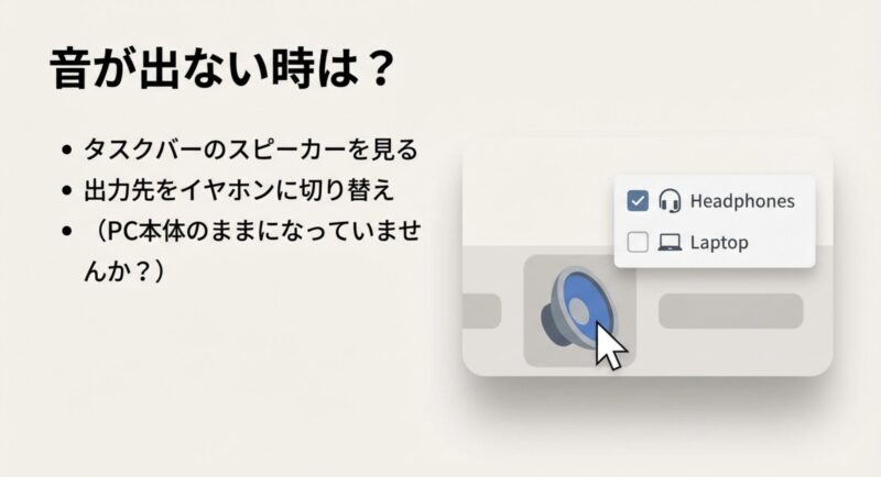 - 音が出ないなら出力切替とアプリ側設定を最優先で確認
