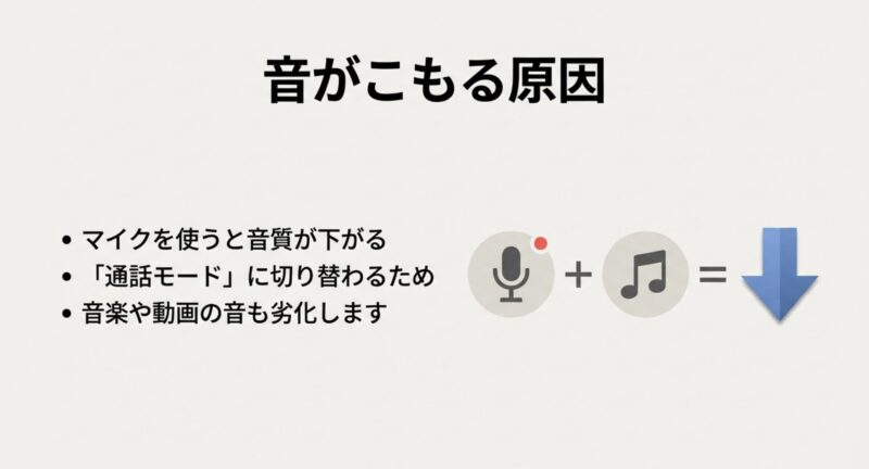| HFP(Hands-Free) | 通話・会議・ボイスチャット | 帯域が狭く、こもりやすい | 使える | 急に音が悪化・モノラル化 |