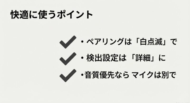 Windows10での割り切りポイント:音楽・動画を快適にするならA2DP(Stereo)を優先。マイクを使うなら音質低下は“仕様寄り”なので、外部マイク併用が現実的です。