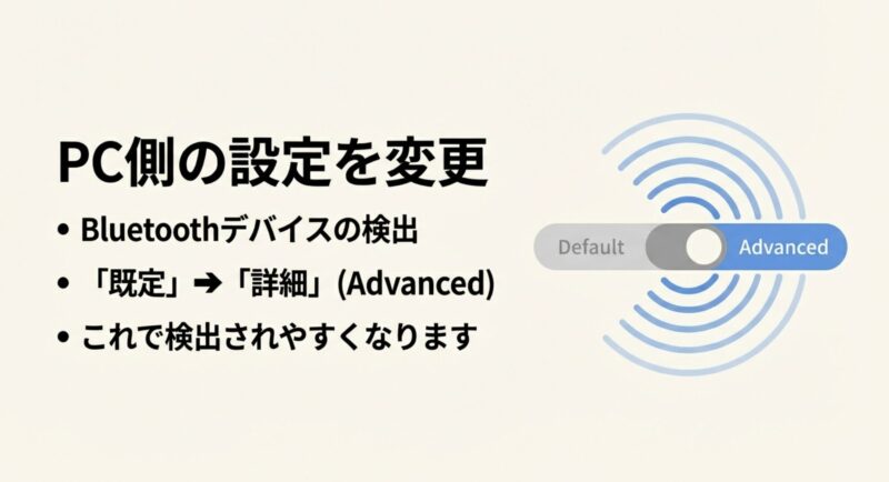 WindowsでAirPodsPro3が検出されないとき、私がまずやるのがBluetoothデバイスの検出をAdvanced(詳細設定)に切り替えることです。