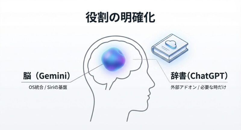 ざっくり言うと、Geminiは「Siriの脳みそ(基盤)」として動き、ChatGPTは「外部の物知りな先生(アドオン)」として動くイメージを持ってください。