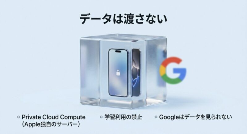 - データ非共有(No Data Sharing):契約上、GoogleはAppleユーザーのデータに一切アクセスできません。処理はAppleの管理下にあるサーバー内(セキュリティバウンダリの内側)で完結します。