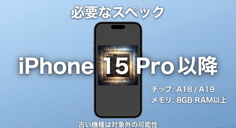 | iPhone | A18 / A19以降 | iPhone 16シリーズ全機種 iPhone 17シリーズ(2026年発売予定) |