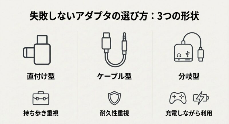 持ち歩き重視なら小型ドングル、耐久性重視なら短ケーブル型、長時間プレイなら分岐、音質重視なら上位DAC…みたいに、同じ「有線イヤホン」でも最適解はけっこう変わります。