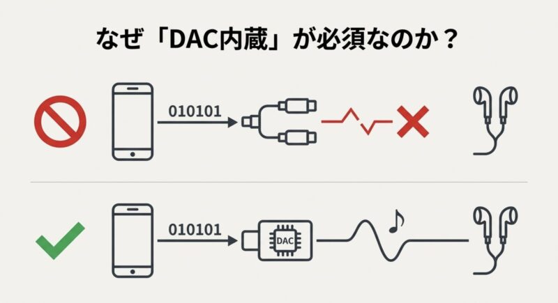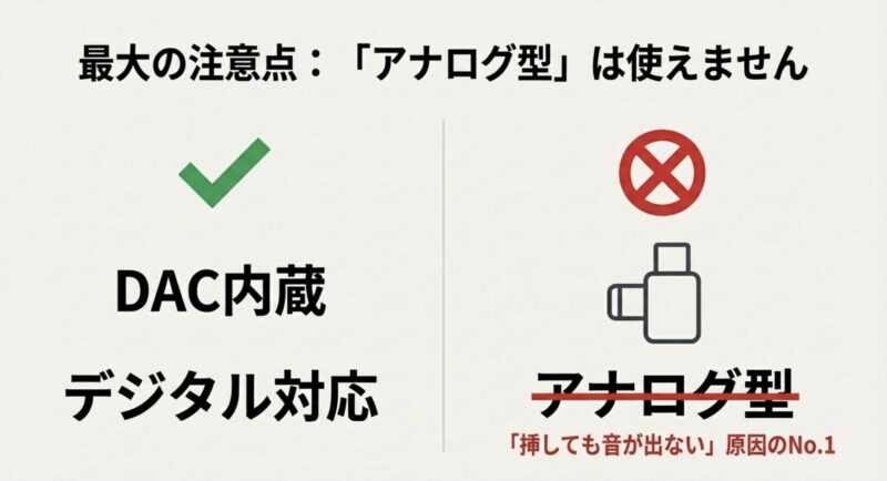 「アナログ型の変換アダプタは非対応」「DAC内蔵が必要」みたいな話は、正直ここが一番大事です。