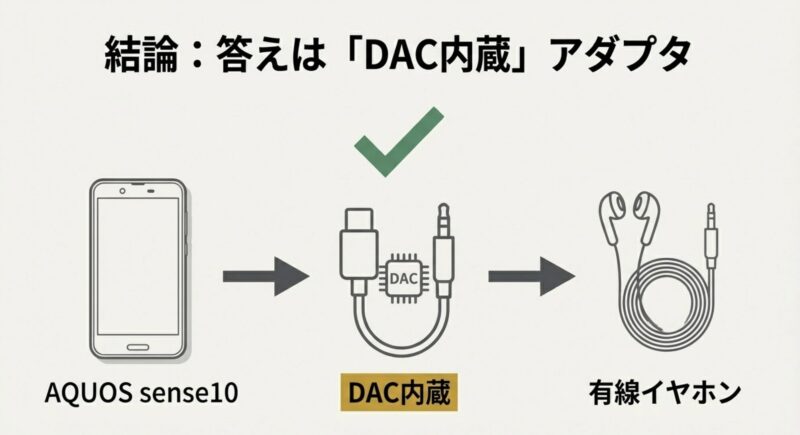 まず大前提として、AQUOSのsense10は「USB-Cからデジタル音声を出す」タイプなので、アダプタ側にDAC(デジタル→アナログ変換)が必要になります。