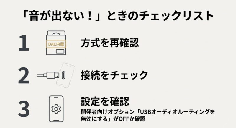 • DAC内蔵のUSB-C変換アダプタを選ぶ(アナログ型は非対応になりやすい)