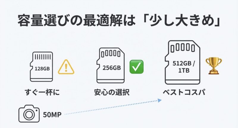 長く使うことを考えるなら、少し余裕を持って256GB以上を選んでおくと安心かなと思います。