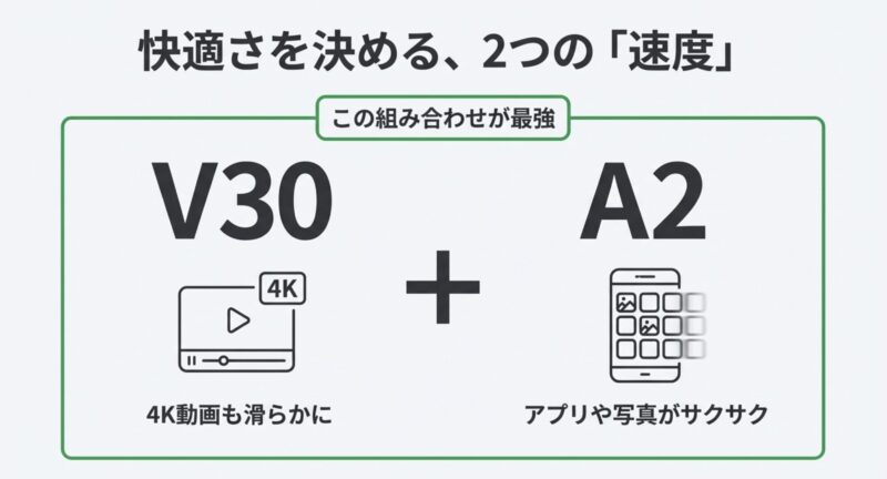 AQUOS sense10のレスポンスを損なわないためにも、「V30」と「A2」のロゴが両方入ったカードを選ぶのが、賢い選び方かなと思います。