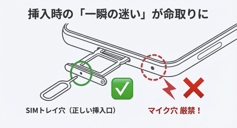 AQUOS sense10の上部にはノイズキャンセリング用のマイク穴があり、トレイのピンホールとよく似ているんです。