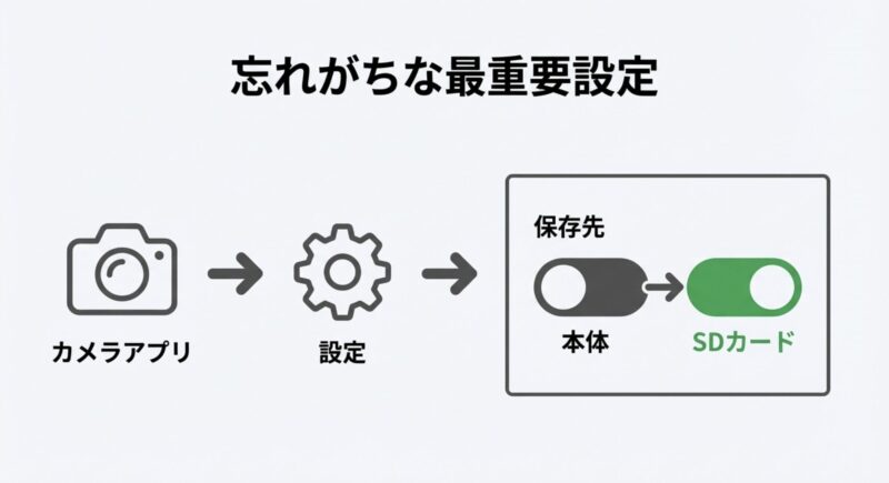 カードを入れた後に初めてカメラを起動すると「保存先をSDカードに変更しますか?」という通知が出ることが多いですが、もし出なかった場合や、後から設定を変えたくなったときのために、正しい変更手順をマスターしておきましょう。