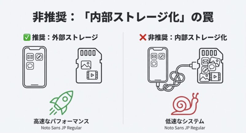 内部ストレージ化してシステムの一部にしてしまうと、スマホ全体の動作が一番遅いデバイス(つまりSDカード)の速度に引きずられてしまい、せっかくのサクサク感が失われてしまうんです。
