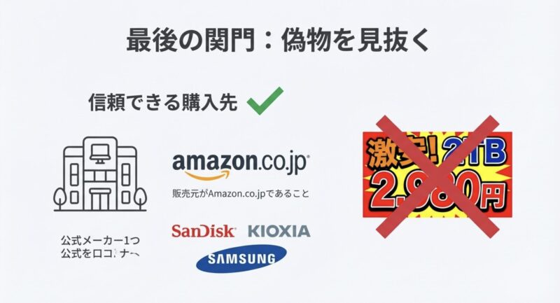 Amazonや海外の通販サイトを覗くと、「2TBで2,980円!」といった、信じられないほど安いカードが売られていることがあります。