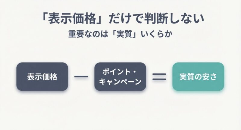 でも実際は、ポイント還元やクーポン、キャンペーンの条件で「実質」が変わります。