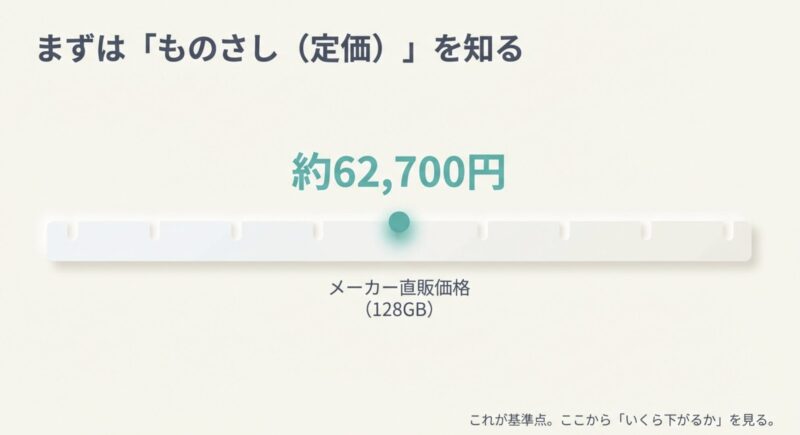 目安として、ドコモは約73,370円、auは約71,800円、ソフトバンクは約69,840円、楽天モバイルは約59,900円(256GBは約65,890円)といったレンジになりやすいです。