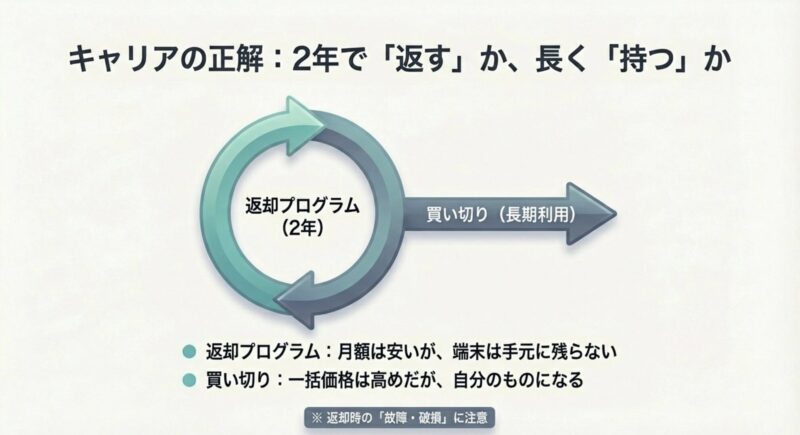 そしてキャリアは、月々の支払いが軽く見える反面、返却や条件で総額が変わるので、あなたの運用スタイルとセットで選ぶのが鉄則です。