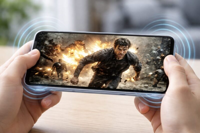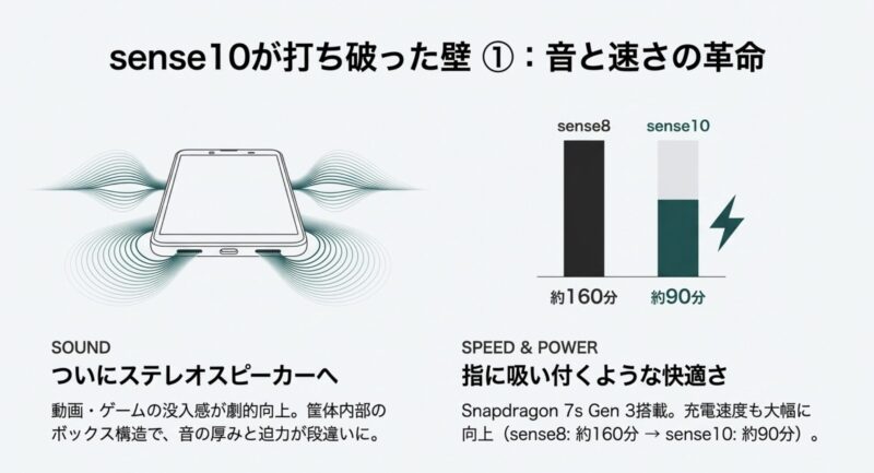 AQUOS sense8の最大の弱点、それは「モノラルスピーカー」でした。画面はきれいなのに、横持ちでYouTubeやNetflixを見ると、音が片側(下側)からしか聞こえず、違和感がありましたよね。