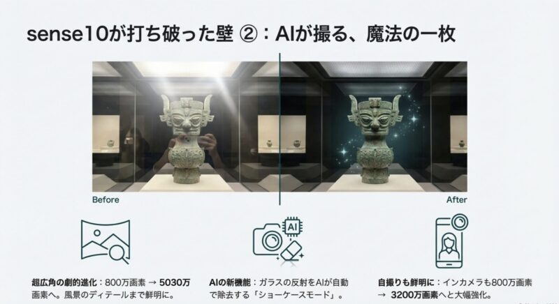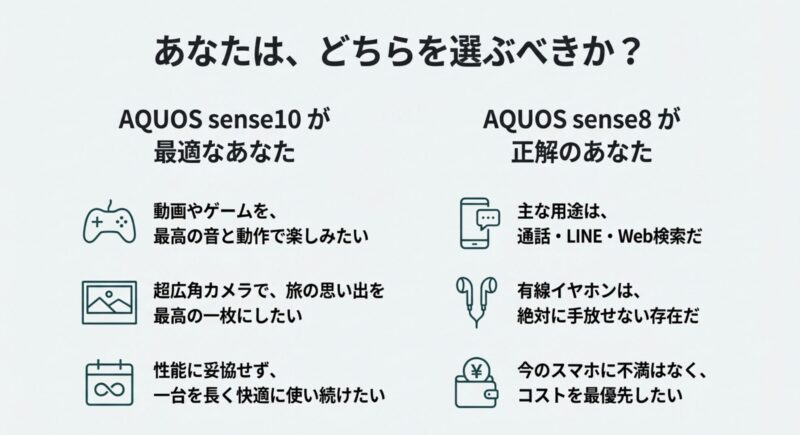 しかし、「スマホで動画をもっといい音で楽しみたい」「ゲームをカクつきなく快適に遊びたい」「旅行先で超広角カメラを使って最高の一枚を撮りたい」という欲求が少しでもあるなら、sense10への買い替えは間違いなく満足できる投資になります。