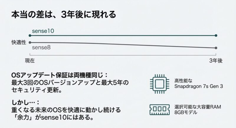 sense10は最新のSnapdragon 7s Gen 3を搭載し、メモリにも余裕があるため、3年後、4年後にAndroid 18や19へアップデートしたとしても、動作がもっさりすることなく快適に動き続ける「余力」があります。(出典:シャープ『AQUOS sense10の特長 – スペック』)