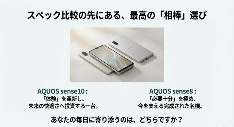 そこで今回は、AQUOS sense10とsense8を徹底的に比較し、スペック表の数字だけでは見えてこないリアルな使い勝手の違いについて、詳しく解説していきます。