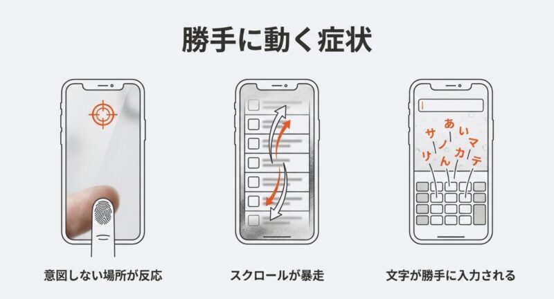 代表的なのは、触ってないのにアプリが開く、画面が勝手にスクロールする、キーボードが暴走して文字が入力される…などです。