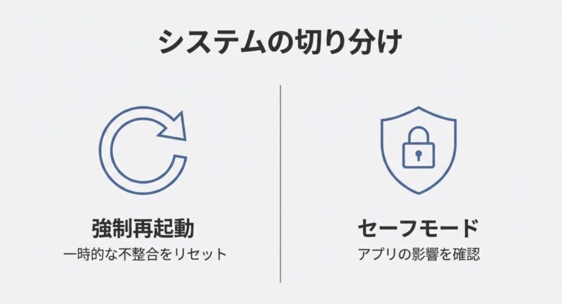 もし改善しないなら、セーフモードと強制再起動で“ソフト側の揺らぎ”を潰して、それでもダメなら修理相談へ。