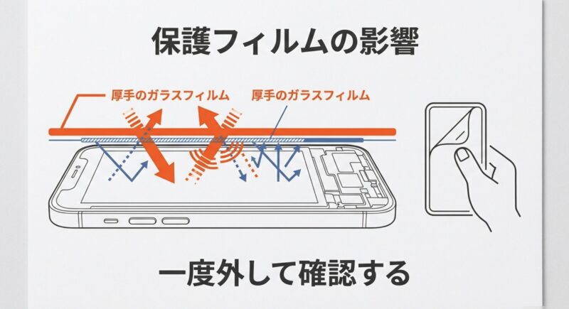 もうひとつ多いのが保護フィルム。特に厚手のガラスフィルムは、機種や個体差によってはタッチのしきい値に影響することがあります。