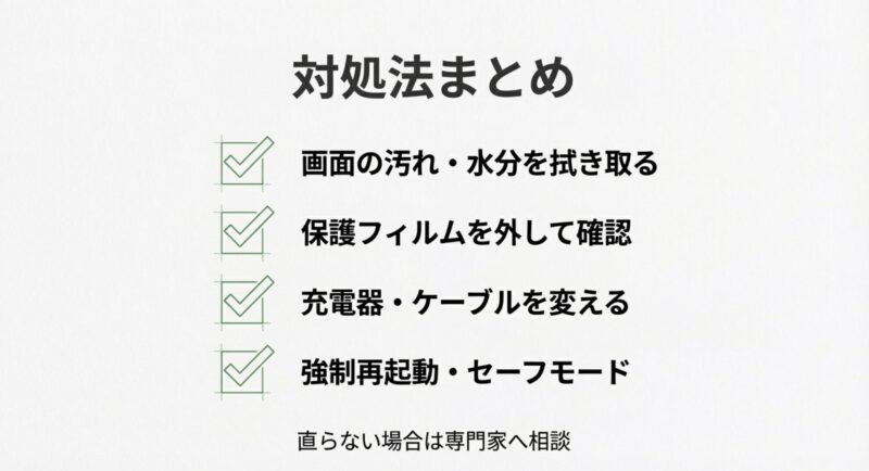 例えば、充電ケーブルを挿した瞬間だけ発生する、お風呂上がりや手が湿っている時に増える、ガラスフィルムに替えてからおかしい…この辺が見えてくると、原因の当たりが付けやすくなります。