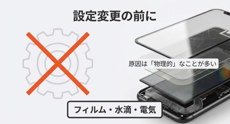 こういう状態なら、次の「原因はフィルムと水分」「ゴーストタッチを直す方法」を上から順にガッと試して、改善しないなら修理判断に進んだほうが早いです。