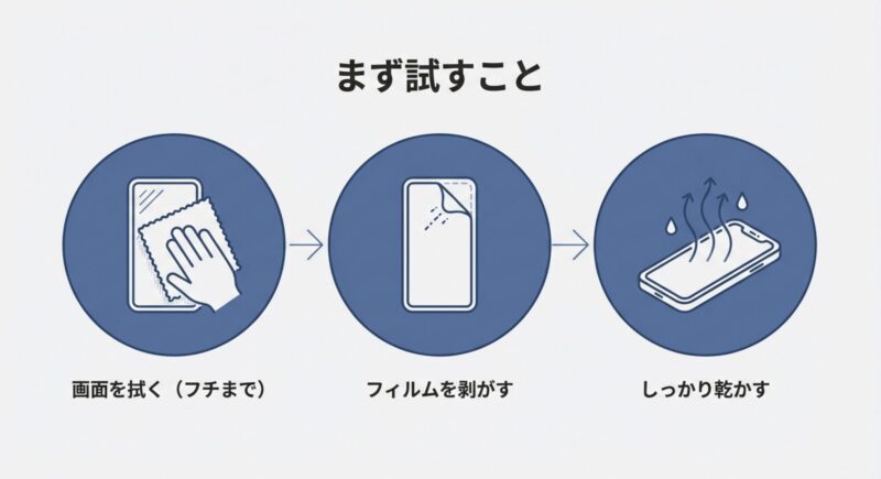 - フィルムなし・乾いた状態でも続くなら修理を視野