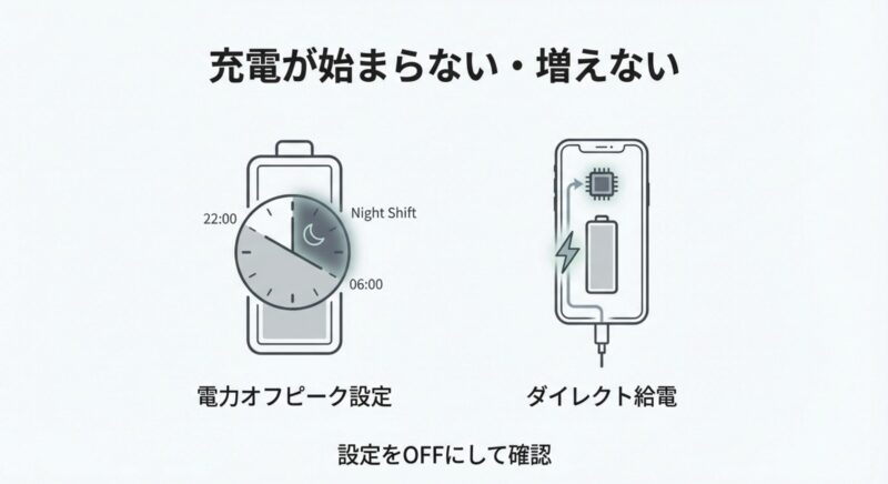 でも実際は、充電器やケーブルの相性、充電口の汚れや水濡れ、電池長持ち充電の85%で止まる設定、電力オフピーク充電で始まらない仕様、ダイレクト給電で増えない見え方など、勘違いしやすいポイントがいくつもあります。