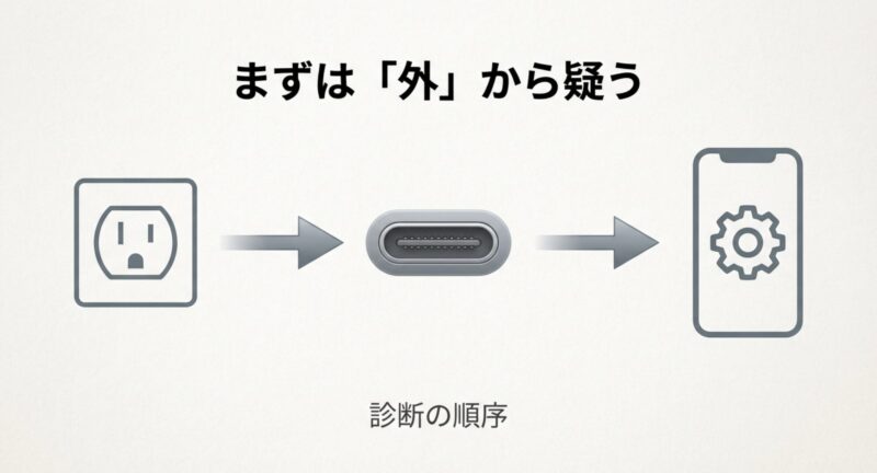 まずは端末が悪いと決めつけず、外部要因(充電器・ケーブル・コンセント)と、安全に関わる要因(水濡れ・発熱)から潰すのが近道です。