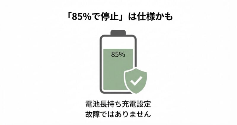 - 85%で止まる・始まらないは電池長持ち充電とオフピーク設定を確認