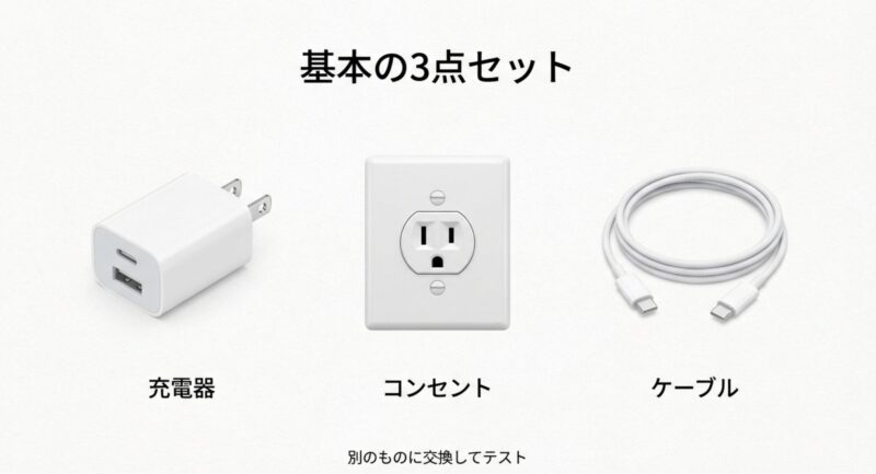 ここで大事なのは、あなたが持っている充電器を片っ端から試すことより、既知に正常な充電器+別ケーブルで一発テストすることです。
