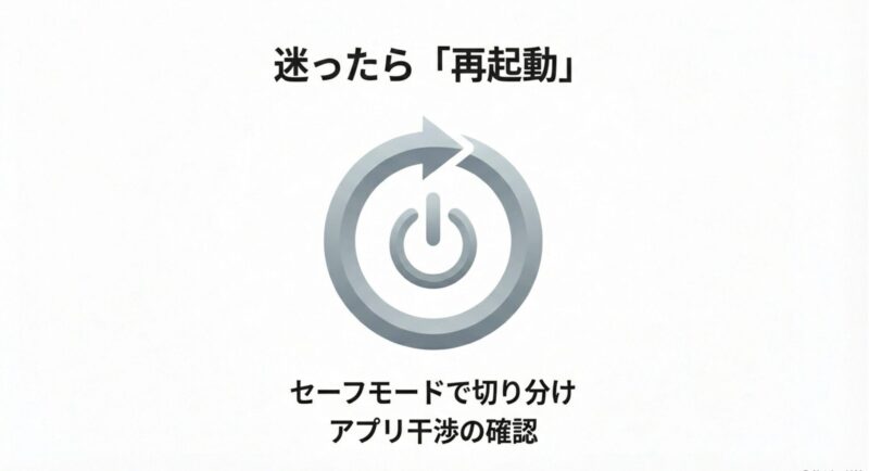 特に、アップデート直後やアプリ大量インストール後に不安定になったときは、まず再起動で様子見が安全です。