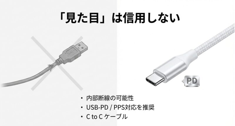 | ケーブルが怪しい | 同じケーブルで粘る | 別の良品ケーブルに即交換 |