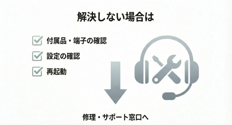 だからこそ、外部要因→端子周り→設定→修理判断の順で進めると、ムダな遠回りが減りますよ。