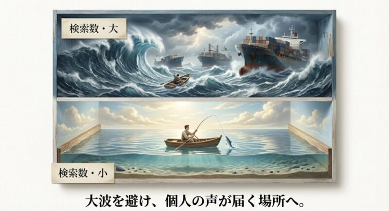 検索数が大きくなくても、悩みが具体的で、しかも競合が薄いキーワードなら、個人でも十分に勝負しやすいです。