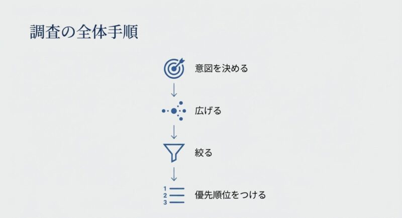 基本の流れはシンプルで、最初にメインテーマを決め、次に関連語を広げ、検索意図ごとにまとめ、競合の強さを見て、最後に記事化の優先順位をつけます。