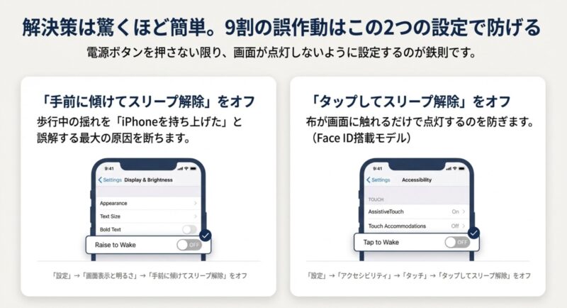 この2つを設定するだけで、電源ボタン(サイドボタン)を物理的に押さない限り画面がつかなくなるため、ポケット内での誤作動は9割以上防げると言っても過言ではありません。