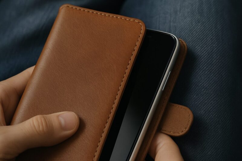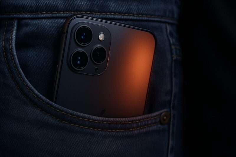 - 画面を外側に向ける(推奨): 多くの人は画面を体の方に向けてポケットに入れますが、これを逆にして、画面を外側(外界側)に向けて収納します。これにより、熱を持った太ももと画面の距離が離れ、静電容量による誤検知のリスクが激減します。ただし、机の角などにぶつけた際に画面が割れるリスクは高まるため、ガラスフィルムなどの保護は必須です。