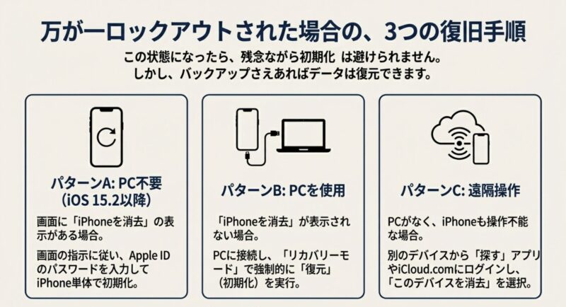 復旧手段は状況により異なり、iOS 15.2以降などでは端末上に『パスコードをお忘れですか?/iPhoneを消去』が表示されればPCなしで消去できる場合があり、表示がない場合はMac/PCで復元(リカバリーモード等)が必要になります。