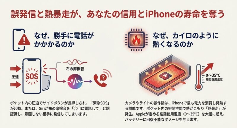 iPhoneをズボンのポケットに入れてたら、いつの間にか勝手に電話がかかっていたり、カメラが起動して本体が熱くなるといった経験はありませんか。
