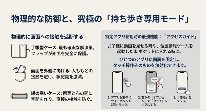 - 手帳型ケースや画面を外側に向ける収納方法が物理的に有効。
