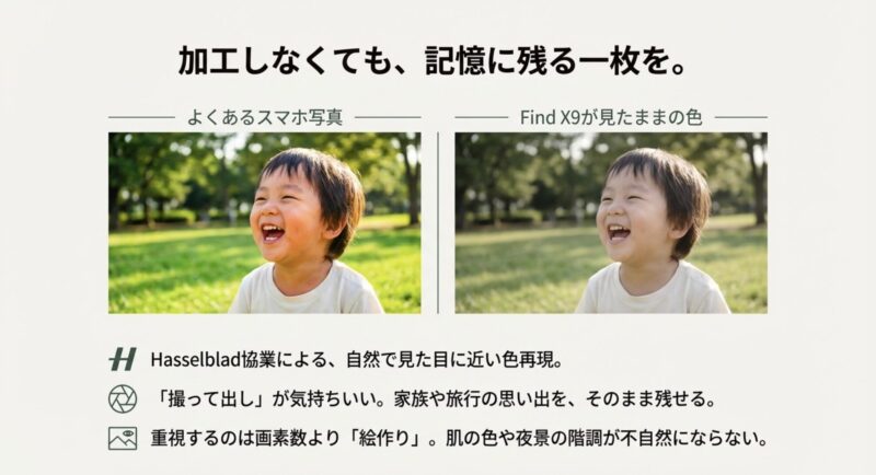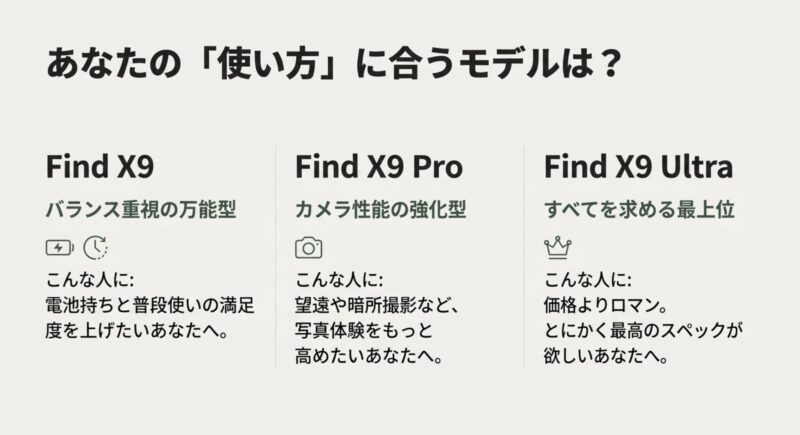 あなたが求めているのが「電池持ちの安心感」と「写真の満足度」なら、Find X9はかなり有力。