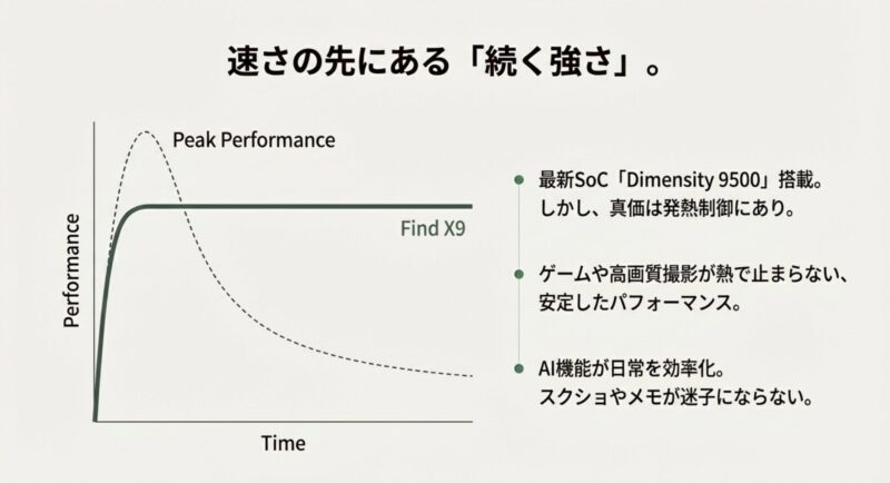 Find X9の注目ポイントは、最新のハイエンドSoCであるDimensity9500クラスを搭載すること。