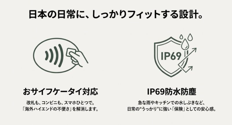 日本での使い勝手(FeliCa)、耐久性(IP69)、上位モデルとの違い、そしてXiaomiやGalaxyと比べてどんな人に刺さるかを、私の感覚で整理します。