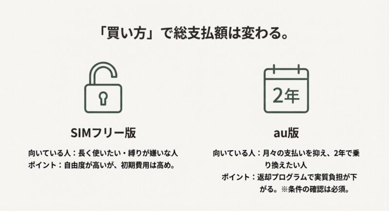 SIMフリーは「端末を素直に買う」イメージで、キャリア(au版)は「分割+プログラム+割引」で実質負担が下がるケースが多いです。