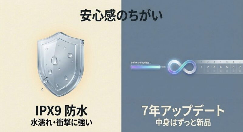 7年間のOS・セキュリティアップデート保証は、数年後にスマホが陳腐化するリスクを完全に消し去ってくれるため、ランニングコストで見れば非常に優れた投資になります。